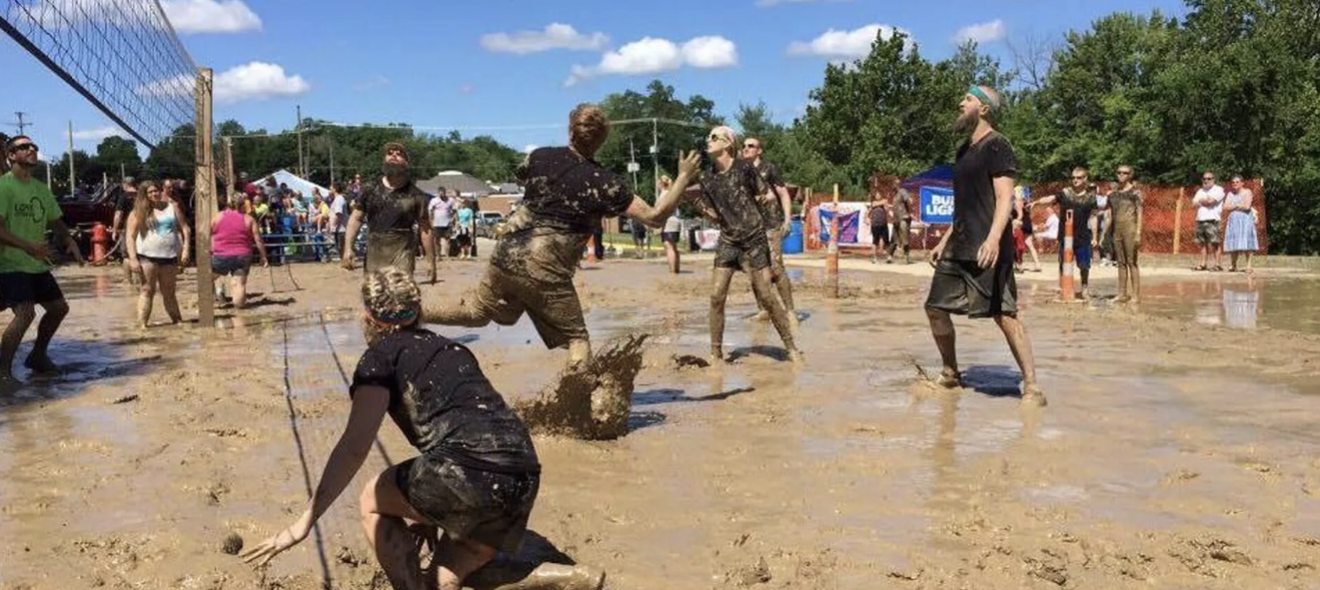 People playing volleyball in the mud at a community event hosted in downtown Otsego